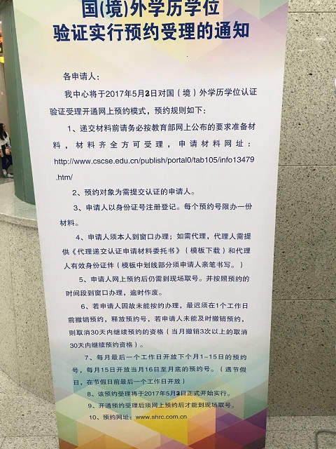 上海學歷認證服務中心將于2017年5月2日對國(境)外學歷學位認證驗證受理開通網上預約模式,預約規則如下: